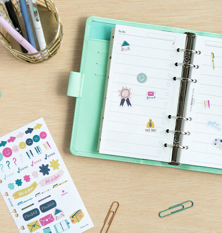 Rendi divertenti commissioni e faccende domestiche con questo set di adesivi multi-fit Everyday Collection. Si tratta di adesivi riposizionabili e scrivibili, grazie al loro particolare finish opaco. Questo set è compatibile con Organiser e Clipbook Filofax formato A5 e Personal, e con i Notebook formato A5 e A4. Include 6 fogli di adesivi caratterizzati da 2 differenti layout.
