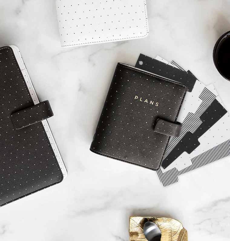 Aggiungi un tocco di stile alle tue pagine con questo set composto da 6 divisori in plastica ultra-durevoli della collezione Moonlight. Caratterizzati da un pattern black and white impreziosito da dettagli dorati, sono compatibili con Organiser Filofax formato Pocket.